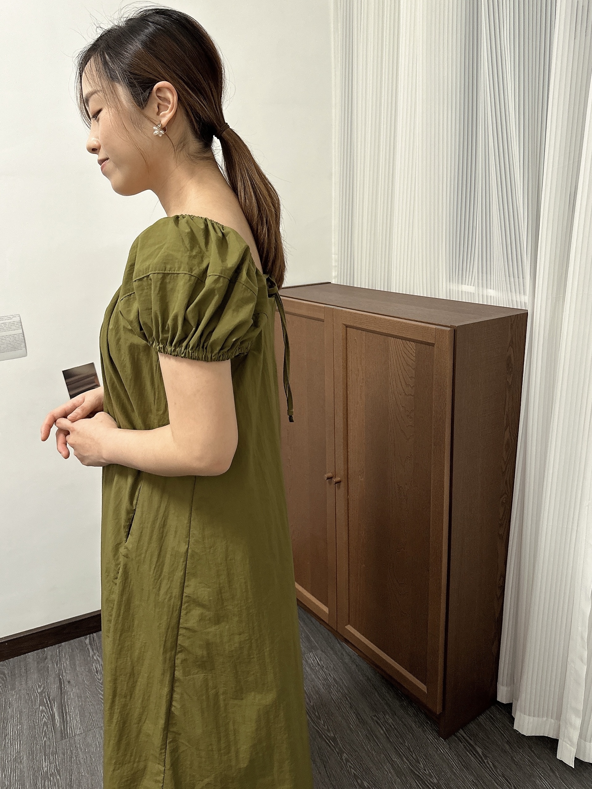 而胸前自然皺褶,讓裙擺看走來有自然的弧度~